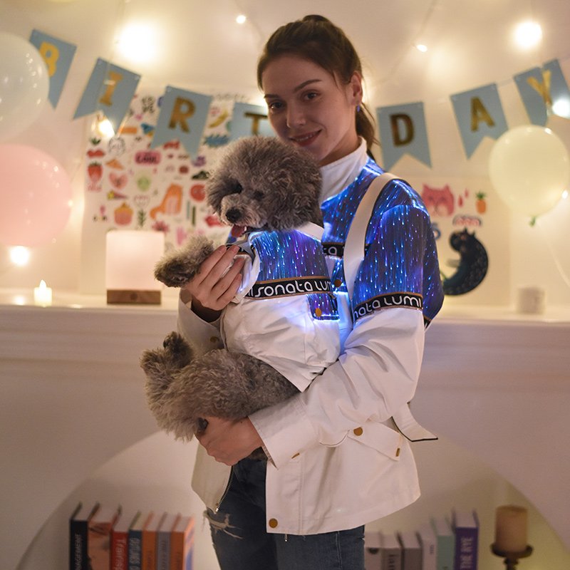 Innovative Illumination: Fiber Optic Fabric for a Radiant Display Our matching outfits feature a dazzling blend of optical fiber fabric (outer) and common fabric (inner), resulting in a durable and lightweight piece of clothing. Available in various sizes, the fiber optic fabric guarantees a mesmerizing visual experience that you and your pet can enjoy together, creating a harmonious ensemble that lights up your world.