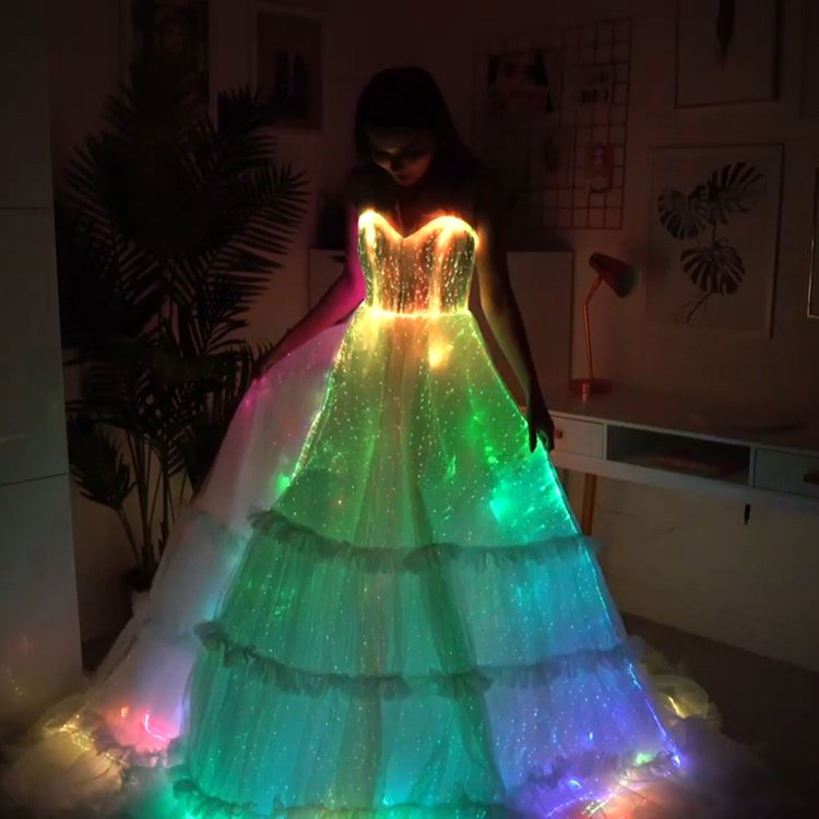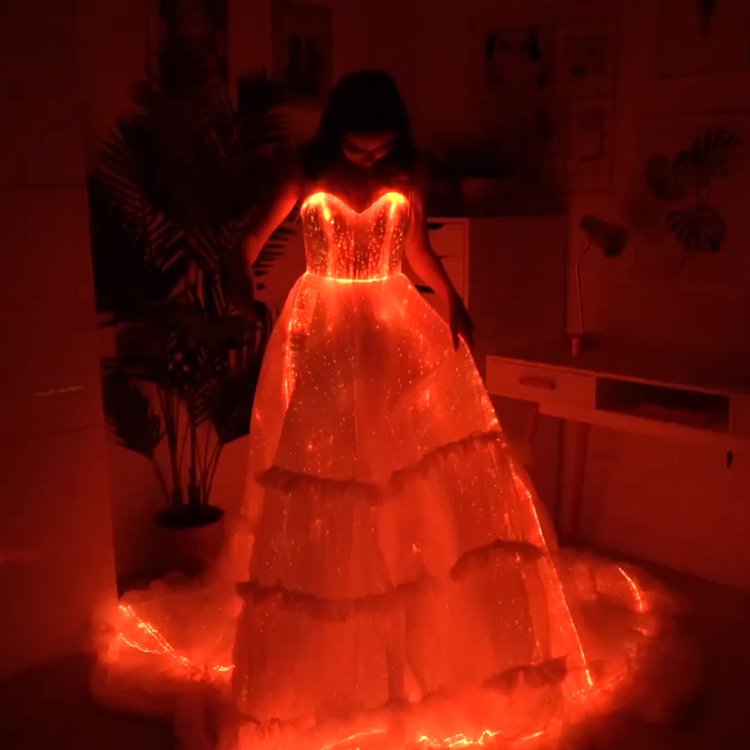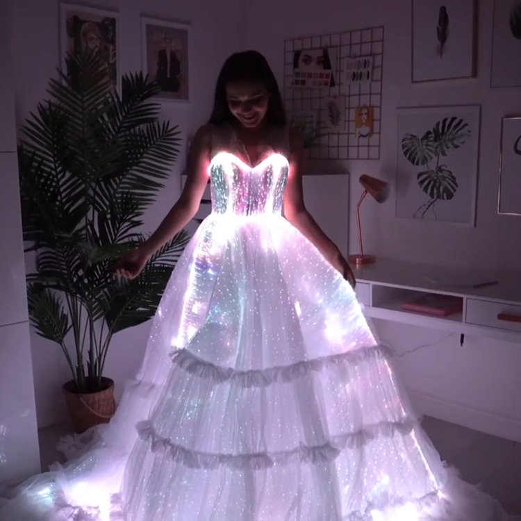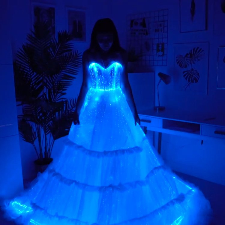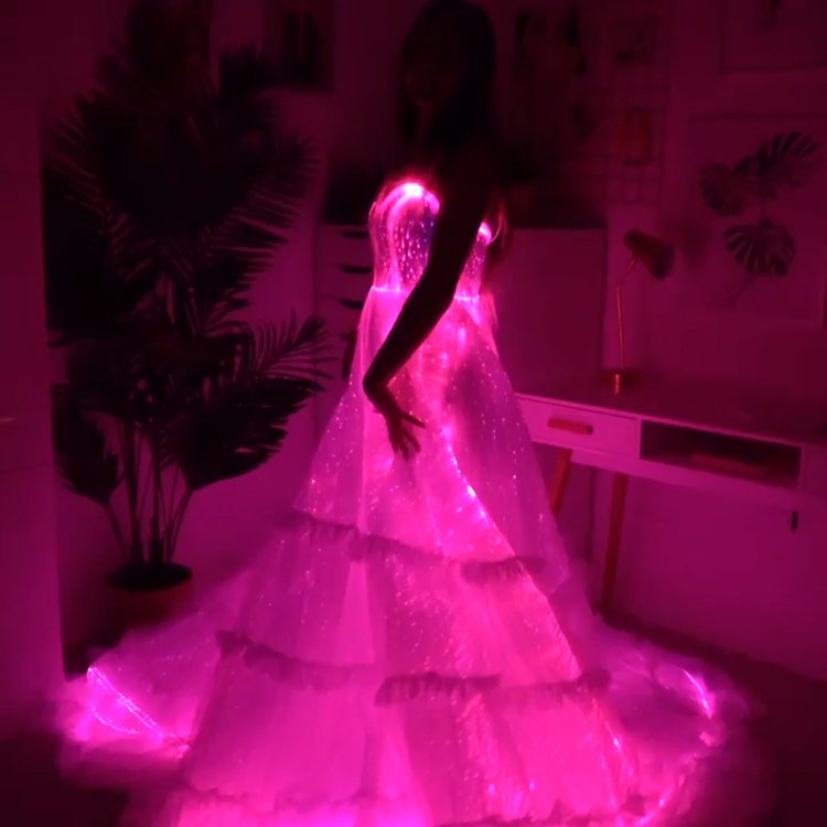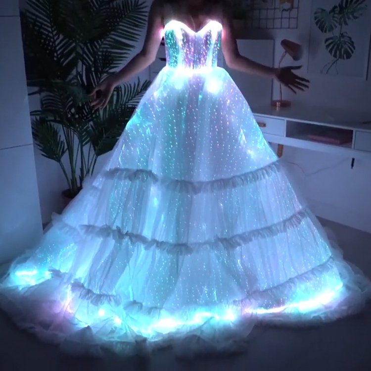 Embrace the future of fashion with this radiant, enchanting evening party dress that blends unforgettable illuminated elegance with cutting-edge technology. Make a statement and leave a lasting impression as you light up the room with your stunning, fiber optic wedding dress.