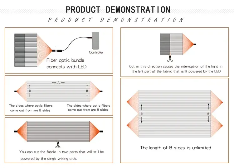 Fabric piece must be cut and the fibers at the B end must be combined with the led light source ,in order to process the semi-finished product,which can be used to make the designed finished product.