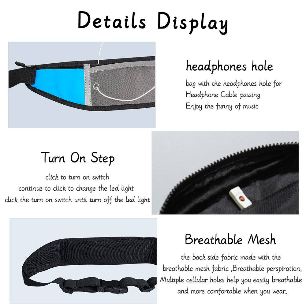 Our light-up running waist pack boasts a headphone hole and reflective loop, effortlessly merging functionality and safety. The headphone hole lets you enjoy your favorite tunes or phone calls hands-free during your workout, while the reflective loop ensures you remain visible during nighttime runs or inclement weather, acting as a reminder for others without functioning as lighting.