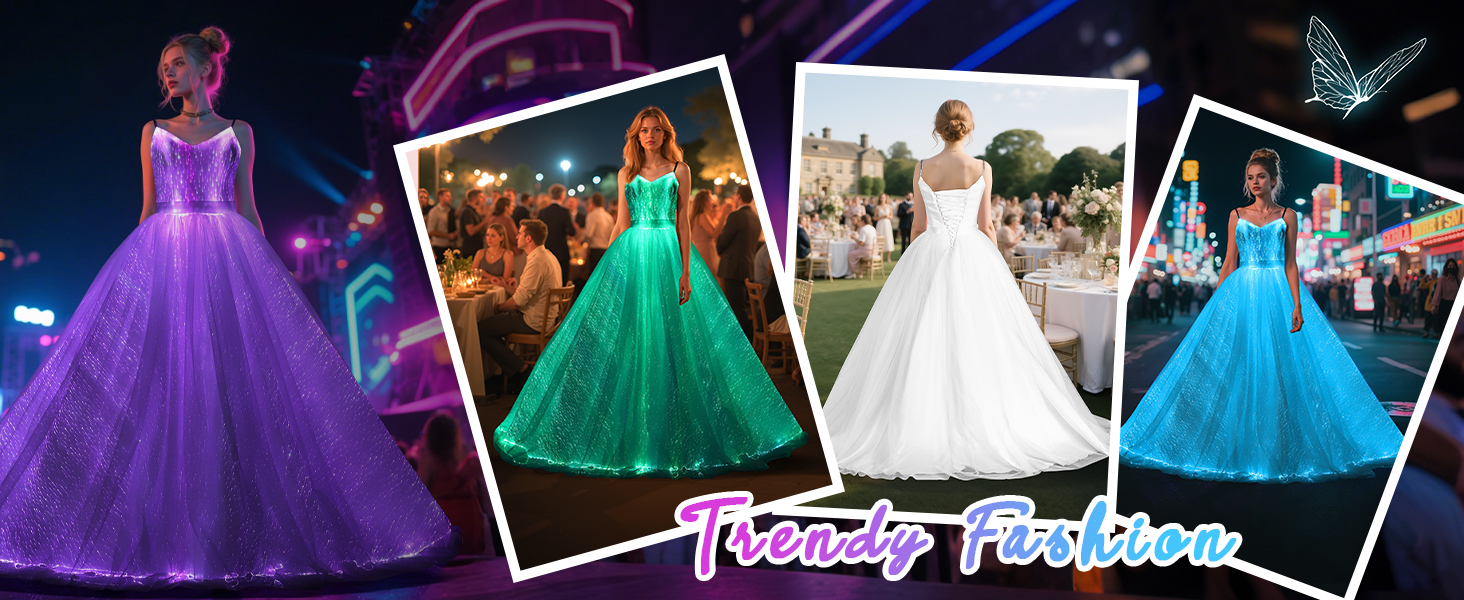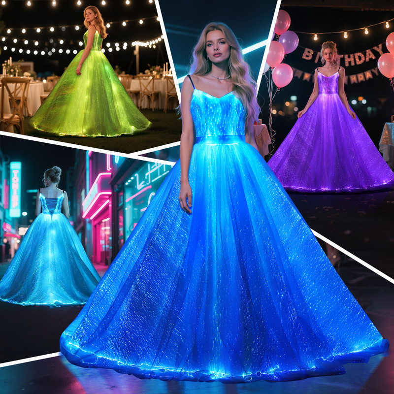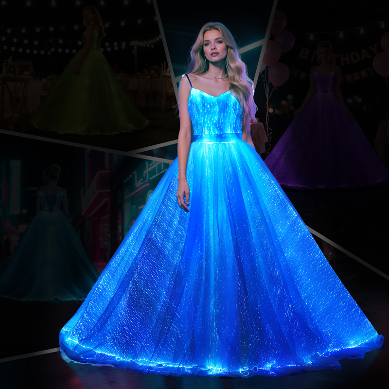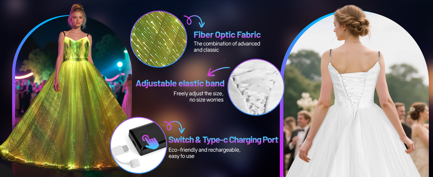 【H-Tech Fabric: Revolutionary Light Technology for Show-Stopping Brilliance】 Illuminate the night with our innovative H-Tech fabric, a patented technology that evenly distributes light across the fabric’s surface. This groundbreaking feature transforms your dress into a dazzling canvas of mesmerizing light, elevating your style to new heights.