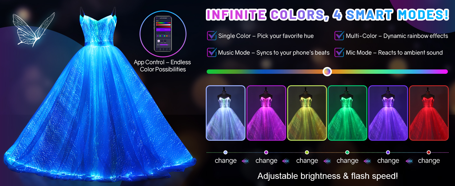 【Color Mode: Dazzling Array of Hues and Patterns】 Imagine a breathtaking fiber optic wedding dress that boasts a vast spectrum of vibrant colors and captivating flashing modes. With monochrome mode featuring red, green, blue, white, pink, purple, and more, polychromatic mode that automatically shifts through a stunning multicolor display, and music and DJ modes syncing colors to the beat of music, this dress ensures you’ll be the center of attention. Adjust brightness and flash speed to suit your preferences.