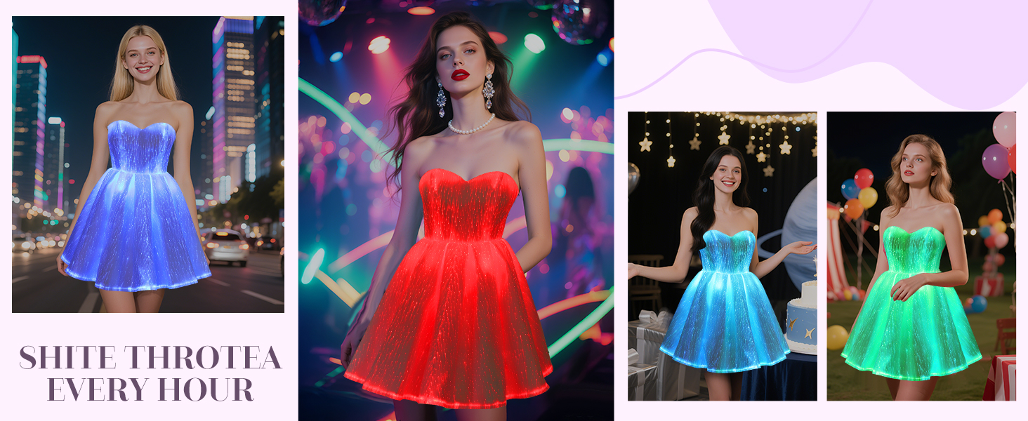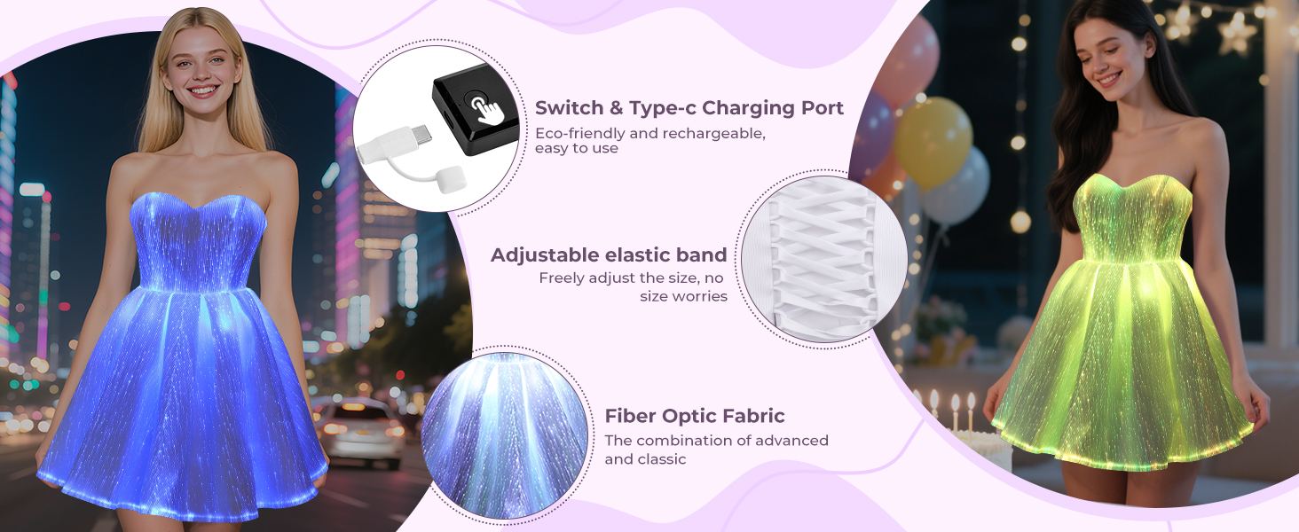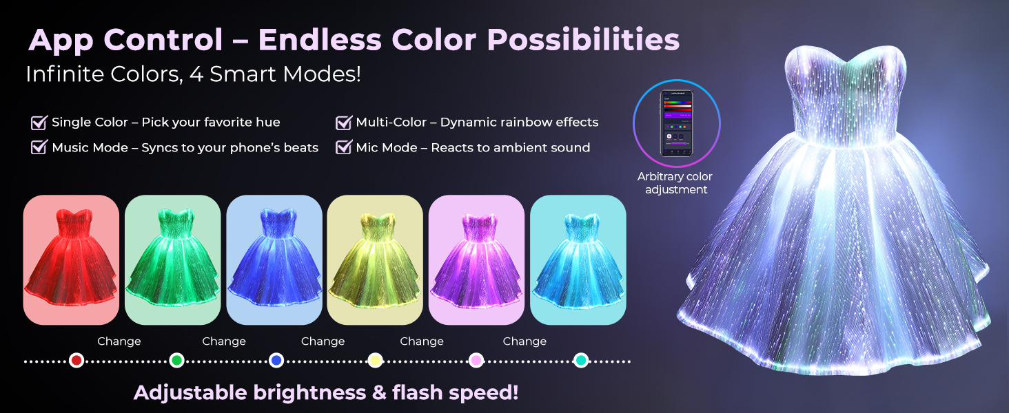 【H-Tech Fabric: Revolutionary Light Technology for Show-Stopping Brilliance】 Illuminate the night with our innovative H-Tech fabric, a patented technology that evenly distributes light across the fabric’s surface. This groundbreaking feature transforms your dress into a dazzling canvas of mesmerizing light, elevating your style to new heights.